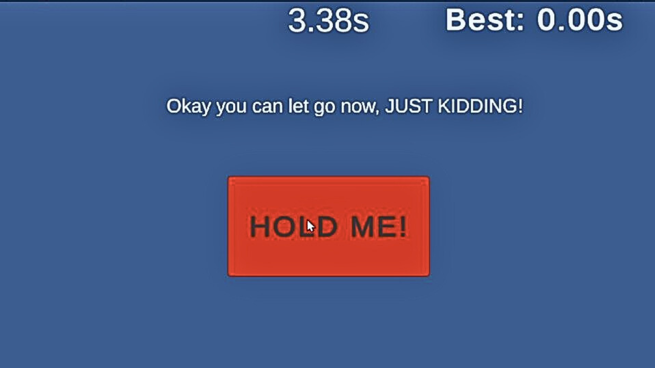 Test your endurance and focus with Hold My Screen, the free online game designed to challenge you to a new personal best. Play instantly in your browser with no downloads! Test Your Focus and Endurance in This Free Online Game How long can you last? Hold My Screen is a simple yet powerful game designed to test your mental endurance and focus. With its clean, minimalist design, this game offers a pure, distraction-free challenge. The mission is simple: hold your finger on the screen for as long as you can. A timer tracks your progress, and with every new personal best, the game updates your record. As you play, the button you need to hold changes colors, keeping you engaged as you chase a new high score. Along the way, motivational quotes will appear to encourage you, making this a unique and rewarding way to practice focus and push your limits. Why Gamers Love Hold My Screen: A True Test of Endurance: This game is a personal challenge against yourself. The only goal is to beat your own best time. Simple & Clean: Enjoy a minimalist design with a single, clear objective and no distractions. Practice Focus: Use this game to train your mind and improve your ability to concentrate for longer periods. Motivation Along the Way: Get inspired to keep going with encouraging quotes as you play. Are you ready to set a new record? Play this free endurance game now and see how long you can last!